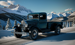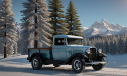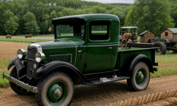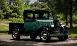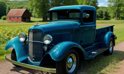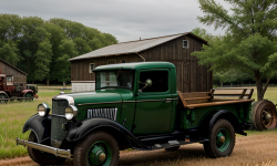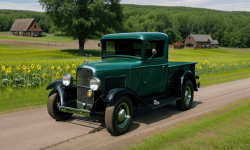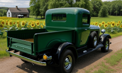 Picture a quaint rural area framed by vast open fields with sunflower plants stretching into the distance. Underneath an azure sky, a majestic 1932 Chevrolet Pickup truck sits proudly centered. The vintage truck is well restored in an authentic green paint, reflecting the era’s charm. A hand-painted wooden fence and a historic barn stand in the background, showcasing the truck’s classic design and the unspoiled rural setting.