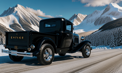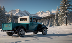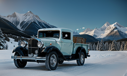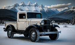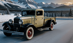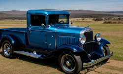A 1932 Chevrolet Pickup with its unique curved hood and pointed grille standing on a rugged, open field under a clear blue sky. The pickup’s design features the iconic six-pointed star and four horizontal bars on the grille, a long running board and fender, and wide, open doors showcasing the interior.