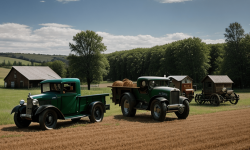 A scenic rural scene set in the 1930s, depicting a vintage 1932 Chevrolet Pickup parked in a large, open farm area with agricultural equipment of the era scattered throughout, such as antique tractors, plows, and hay balers, with a rustic old barn serving as the backdrop, showcasing the strong connection between the pickup and agricultural industry of that time period.