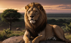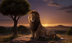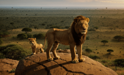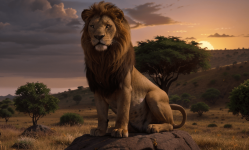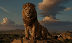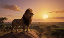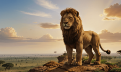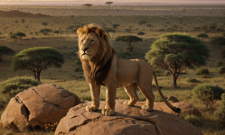 Generate an image of Simba, the young lion, standing triumphantly on Pride Rock, looking over the vast savannahs of Africa, symbolizing his struggle, courage, and ultimate redemption as he claims his rightful place as the new king of the Pride Lands in the cinematic tale of The Lion King.