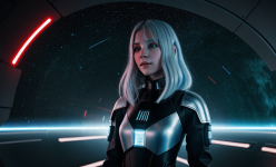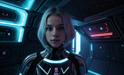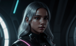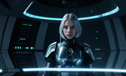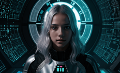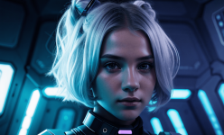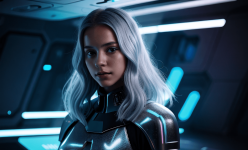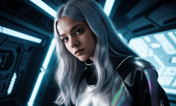 Create an abstract photo of a futuristic Swedish girl with silver hair, engaging with a holographic AI in a Star Wars-inspired setting. Use bounced lighting to enhance the scene, and apply a Dutch angle for a dynamic perspective. The environment should feature sci-fi elements, blending technology and fantasy, while the girl’s expression conveys curiosity and wonder. Focus on vibrant colors and intricate details to bring the futuristic atmosphere to life.