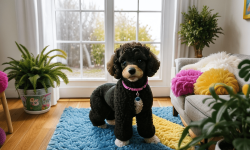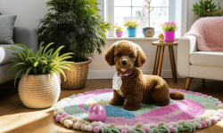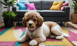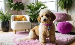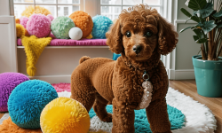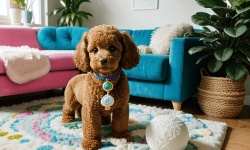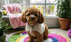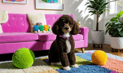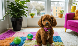 A cute toy poodle with fluffy, curly fur and bright, expressive eyes sits on a colorful rug in a cozy living room. Sunlight streams through a window, casting soft shadows. The poodle is surrounded by various toys, including a squeaky bone and a plush ball. Cheerful artwork adorns the walls, and a potted plant adds greenery, creating a warm and inviting atmosphere.