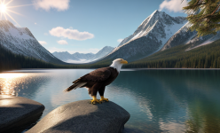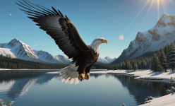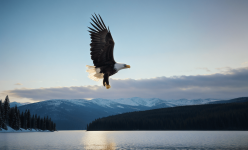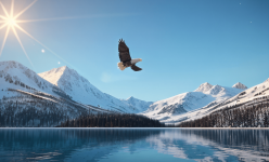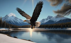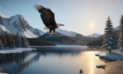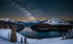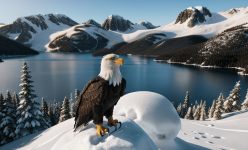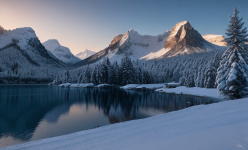 Create a serene winter scene featuring a tranquil lake surrounded by majestic snow-capped mountains. The lake reflects the clear blue sky, with gentle ripples on the surface. Pine trees dusted with snow line the shore, and a soft blanket of snow covers the ground. In the distance, the mountains rise dramatically, their peaks glistening in the sunlight. The atmosphere is peaceful and crisp, evoking the beauty of a quiet winter day in nature.
